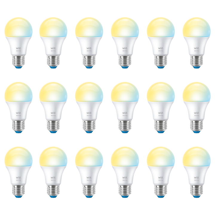 *Pack x18 lamparas* Lampara LED Inteligente WiZ A60 E27 806 lm Luz Blanca Regulable La bombilla inteligente WiZ A60 de 8 W te ofrece la flexibilidad de elegir entre luz blanca cálida y fría para cada momento del día. Con su casquillo estándar E27 y diseño clásico A60, se adapta fácilmente a la mayor...