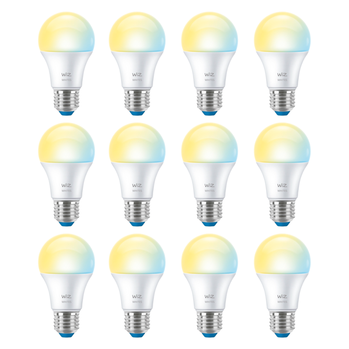 *Pack x12 lamparas* Lampara LED Inteligente WiZ A60 E27 806 lm Luz Blanca Regulable La bombilla inteligente WiZ A60 de 8 W te ofrece la flexibilidad de elegir entre luz blanca cálida y fría para cada momento del día. Con su casquillo estándar E27 y diseño clásico A60, se adapta fácilmente a la mayor...