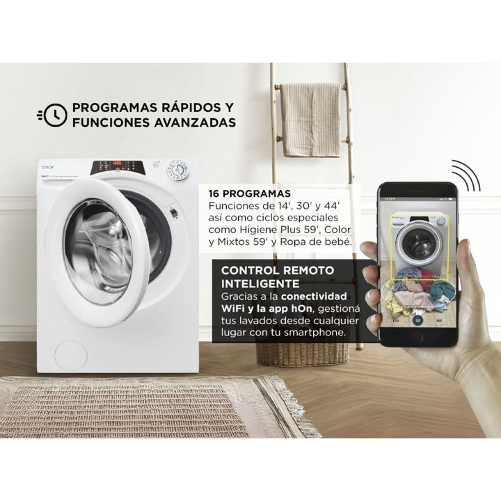 Lavado inteligente desde tu celular Conectá el Candy RO1274DWMT a la app hOn y controlá tus ciclos de lavado desde cualquier lugar. Programá, monitoreá y recibí recomendaciones personalizadas para optimizar cada carga. Ahorro energético sin sacrificar potencia Su motor Inverter reduce el consumo y e...