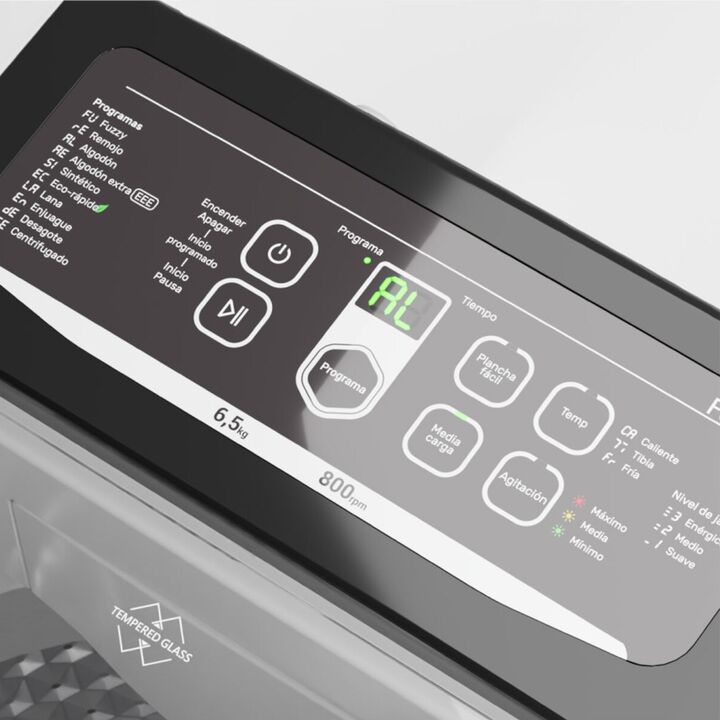 Lavarropas de carga superior. Su capacidad de lavado es de 6,5 Kg y su velocidad de centrifugado es de 800 RPM. Color blanco. Eficiencia A+. Sistema oriental. Cuenta con Display LED digital y botones. Su tapa es de vidrio templado y su tambor de acero inoxidable. Posee alarma fin de lavado, selector...