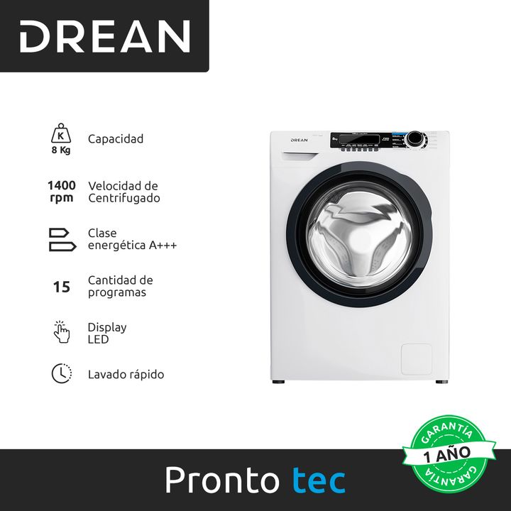 El lavarropas de carga frontal Drean con capacidad de lavado de 8 kg y una velocidad de centrifugado de 1400 RPM, cuenta con 15 programas de lavado para que puedas elegir el que mejor se adapta a lo que necesitas. Contando con lo último en tecnología para darte lo mejor en lavado, con la tecnología ...