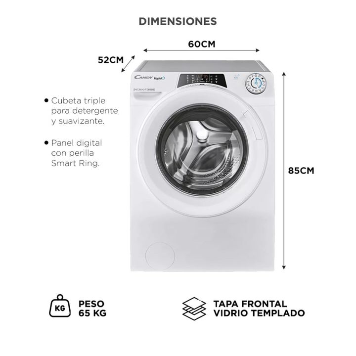 Tecnología inteligente para tu lavado diario El lavarropas frontal Candy de 9kg detecta automáticamente la carga y ajusta el consumo de agua y energía, optimizando cada ciclo sin que tengas que hacer nada. Control desde tu celular con WiFi integrado Conectá la app Candy Simply-Fi y manejá el lavado ...