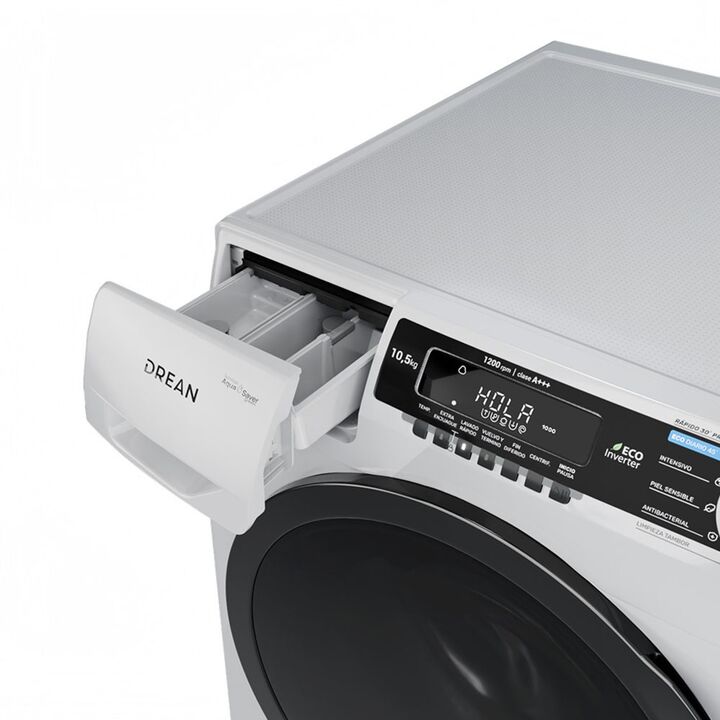 Lavarropas Ecoinverter 10,5 Kg 1200 RPM Blanco Drean - LCFDR1012SB0 Lavarropas automático de carga frontal. Tecnología Ecoinverter. Capacidad de 10,5 Kg. Color blanco. Hasta 1200 RPM. Eficiencia A+++. Sistema de lavado europeo. 13 programas. Display LED con perilla. Luz en tambor. Bloqueo para niños...