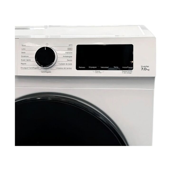 ESPECIFICACIONES: Color: Blanco Capacidad de carga: 7 Kg Velocidad de Centrifugado: 1200 RPM Eficiencia energética: C Tecnología Inverter: Si Dimensiones (Alt x Ancho x Prof): 84.5 x 59.5 x 47 Cm 15 Programas de Lavado