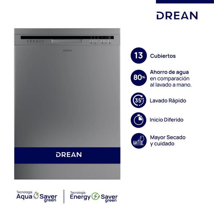 Lavavajillas con capacidad de lavado de 13 cubiertos. Color inoxidable. Eficiencia A+. Cuenta con 2 cestos separadores y 1 cesta para cubiertos. Cuenta con pantalla LED y botones. 6 programas de lavado: Pesado, Normal, Rápido de 35 minutos, ECO, Vidrio y Enjuague. Funciones: Media carga y Secado +. ...
