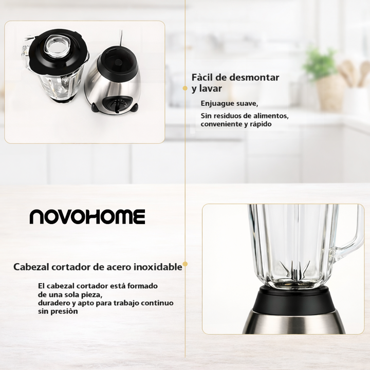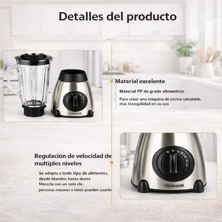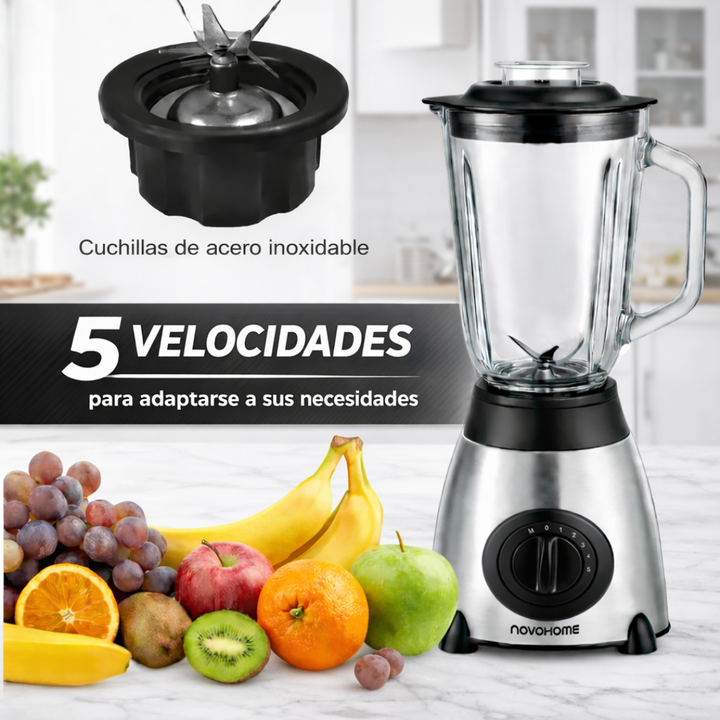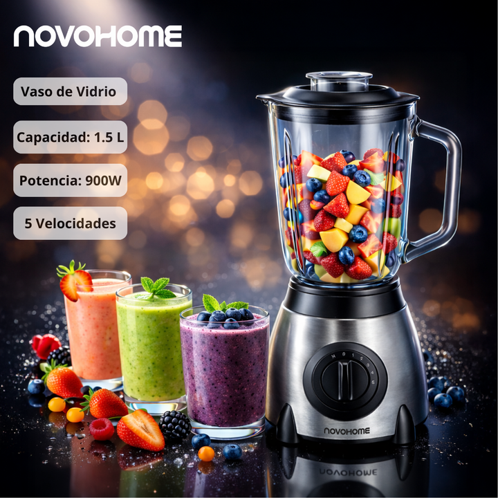 NOVOHOME LICUADORA 5 VELOCIDADES 900W SKU: NH-BLX6000 POTENCIA QUE INSPIRA CADA MEZCLA Nuestra licuadora eléctrica con cinco velocidades te da el control absoluto para lograr la textura perfecta en cada preparación. Desde batidos suaves hasta mezclas intensas, combina potencia, precisión y durabilid...