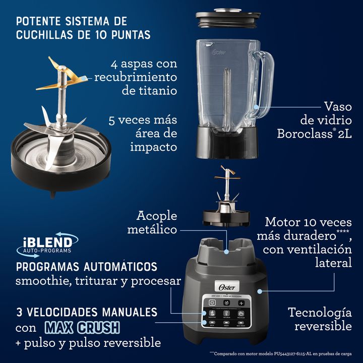 La licuadora profesional Oster XTREME MIX combina potencia y tecnología avanzada. Su cuchilla de 4 niveles con patented Titanium Blade Technology y 10 aspas ofrece 5 veces más área de impacto, triturando, mezclando y pulverizando ingredientes duros. Cada nivel de la cuchilla tiene una función: las 4...