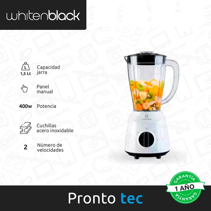 La licuadora de Whitenblack es un electrodoméstico versátil y eficiente, diseñado para facilitar la preparación de tus bebidas y batidos favoritos. Cuenta con un baso de plástico resistente con una capacidad de 1,5 litros, un potente motor de 400 watts que te garantiza un rendimiento óptimo, dos vel...