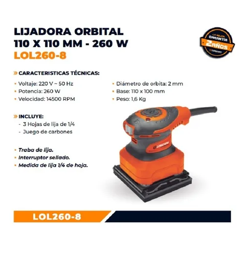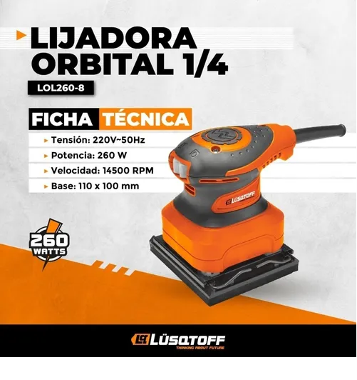 LIJADORA ORBITAL LUSQTOFF LOL260-8 260W HOJA 14500RPM 1/4 Con esta lijadora lograrás trabajos de mayor calidad para tus clientes, ya que te permitirá realizar tareas de lijado en diferentes materiales con el mejor resultado. ¡Conseguí detalles únicos! Practicidad y versatilidad en una sola herramien...