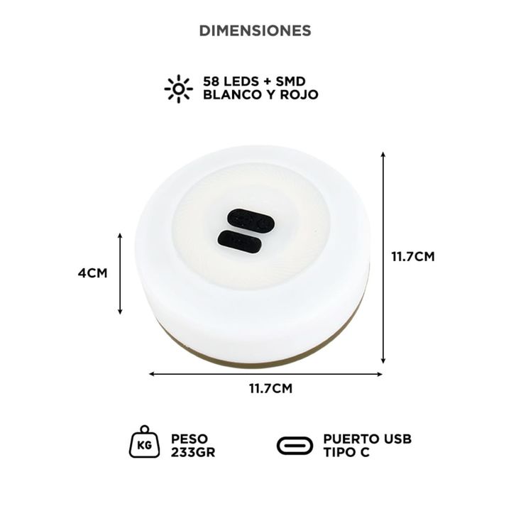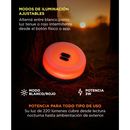 Control por doble interruptor y app: Alterná entre blanco pleno, tenue y rojo intermitente o activá los modos RGB con tu celular. Alta eficiencia lumínica: Equipado con 58 LEDs + 36 SMD, ofrece luz cálida de hasta 220 lúmenes. Indicador de energía visible: Visualizá la batería disponible en pantalla...