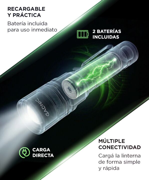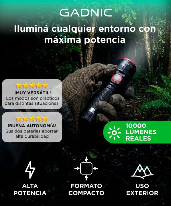 ILUMINACION DE ALTA POTENCIA La linterna Gadnic L 008 ofrece una potencia real de 10000 lumenes Permite iluminar grandes superficies con un haz intenso y definido Es ideal para exteriores emergencias y uso nocturno Aporta visibilidad confiable cuando mas se necesita DISEÑO COMPACTO Y PORTATIL Su for...