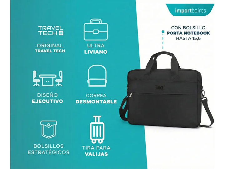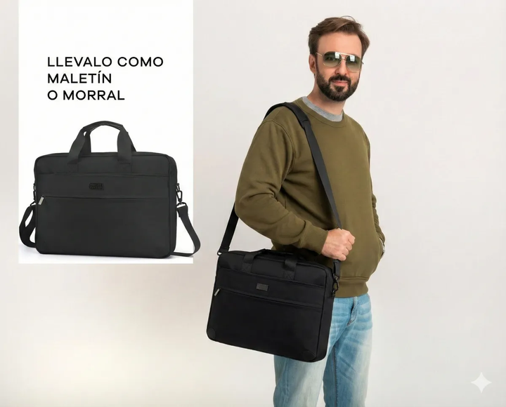 MALETÍN MORRAL PORTA NOTEBOOK EJECUTIVO TRAVEL TECH -Amplio compartimiento principal -Bolsillo separador acolchado para dispositivo de hasta 15,6 pulgadas -2 bolsillos organizadores internos-Tres bolsillos frontales, 2 frontales y uno trasero -Correa con pad antideslizante para usar bandolera. -Mani...