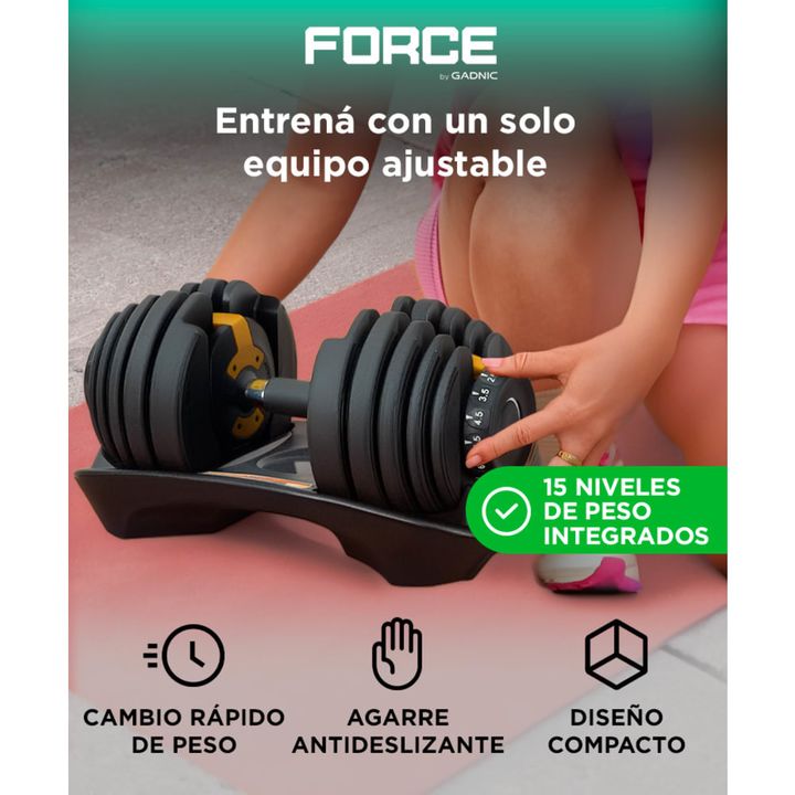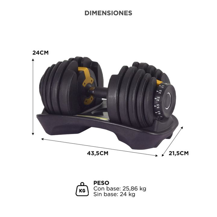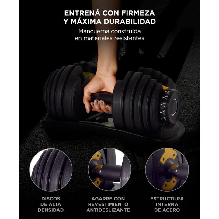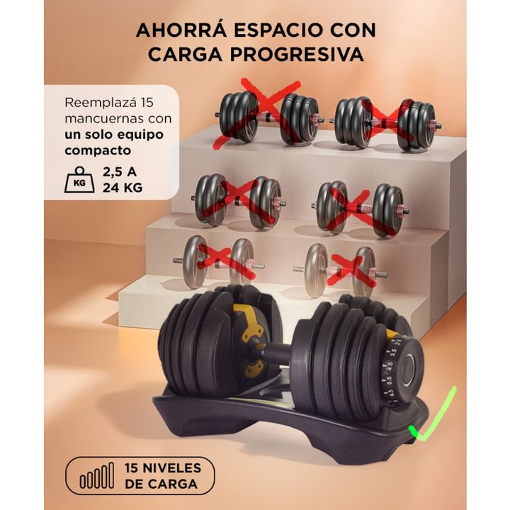 15 niveles de peso en un solo equipo: Reemplazá un set completo de mancuernas con un único diseño compacto. Ajustá desde 2,5 hasta 24 kg con un solo giro. Selector rápido y seguro: El sistema de dial lateral permite cambiar de carga en segundos sin necesidad de herramientas. Entrená sin interrupcion...