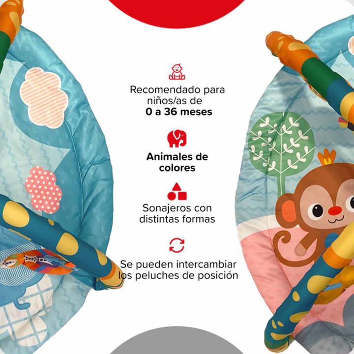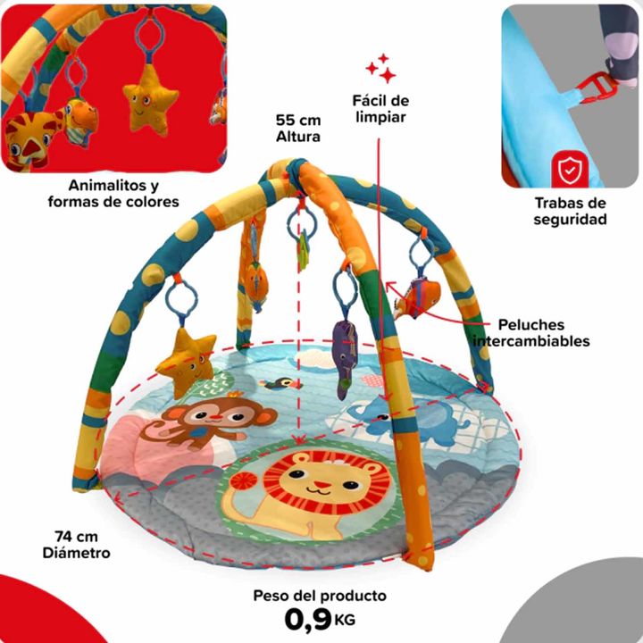 El Gimnasio de Actividades Nautis León invita a jugar en la selva con un tapete lleno de colores vibrantes y amiguitos salvajes como el león, el mono y el elefante. Con juguetes colgantes en distintas formas, texturas y sonidos, este espacio acolchado ofrece estimulación sensorial y diversión desde ...