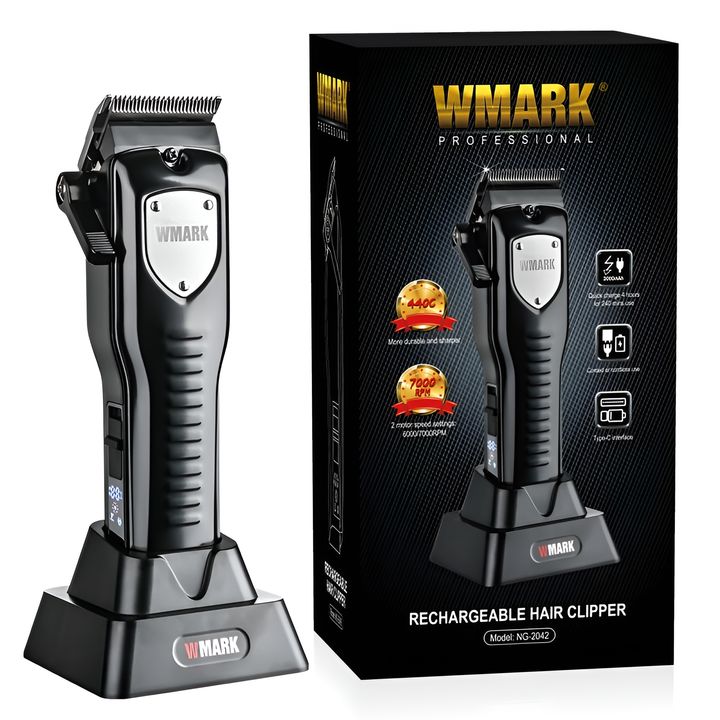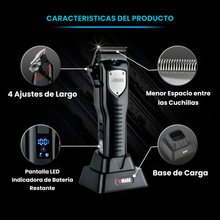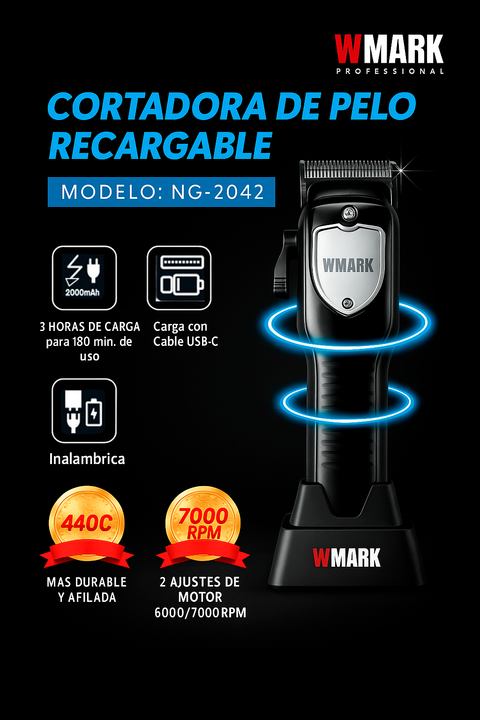 CORTADORA DE PELO PROFESIONAL INALAMBRICA WMARK SKU: NG-2042 - Cuchilla cónica 440C + cuchilla móvil de cerámica. - 4 Niveles de longitud de corte ajustables: 0.8, 1.2, 1.6, 2.0 mm. - 2 Velocidades del motor: 6,000/7,000 RPM. - Batería de iones de litio: 2,000 mAh. - 3 horas de carga completa para 1...