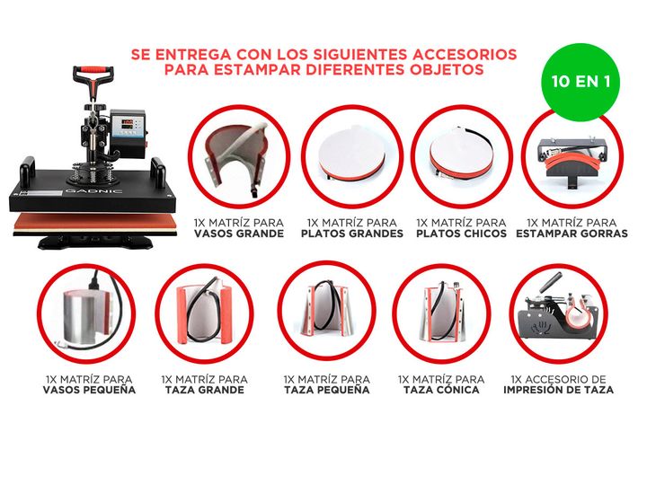 ¡Gadnic presenta su nueva línea de máquinas de estampado! En esta ocasión te ofrecemos una máquina de estampado multifuncional 10 en 1 para nivel profesional o amateur, ideal para diseñar en casa, en tienda y más. Nuestra máquina Gadnic te ofrece la oportunidad de estampar por transferencia de color...