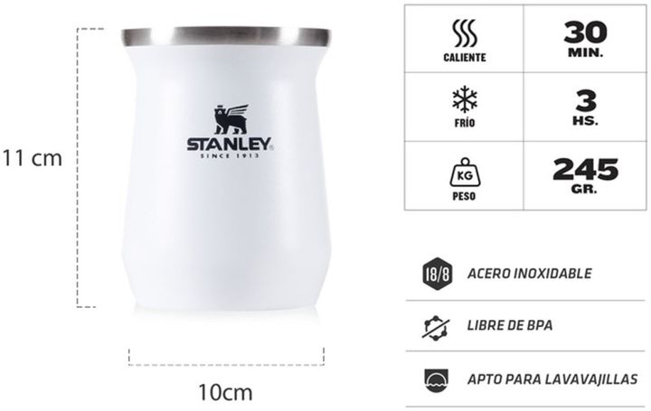 MATE 236ML POLAR STANLEY -Capacidad 236ml -Es un accesorio icónico que ha demostrado ser práctico y fácil de limpiar, además de mantener la temperatura durante toda la cebada. Este producto es muy popular en Argentina debido a su capacidad de mantener la temperatura caliente durante 30 minutos y frí...