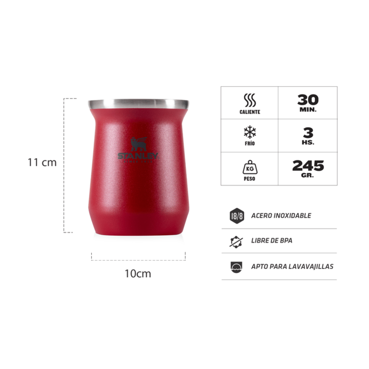 El mate Stanley mantiene la temperatura durante toda la cebada. Es práctico e higiénico. DIMENSIONES: Alto: 11 cm Diámetro: 10 cm DETALLES: Aptos para lavavajillas Acero inoxidable 18/8 Sin BPA