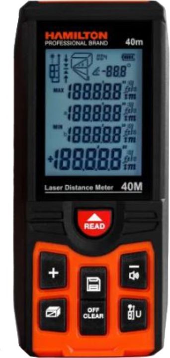 MEDIDOR DE DISTANCIA LASER MD40 40M HAMILTON MEDIDOR DE DISTANCIA L¦SER Sólida contrucción. # Distancia máx.: 40 m. # Realiza mediciones de tipo lineales,volumétricas y pitagóricas. # Unidades de medida: metros / pulgadas / pies. # Pantalla LCD retroiluminada. # Gabinete IP54 a prueba de agua y polv...