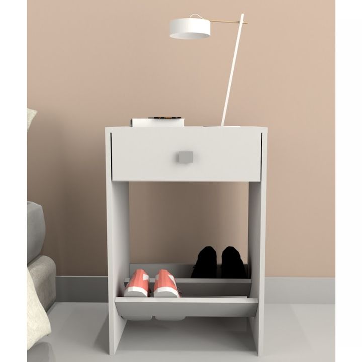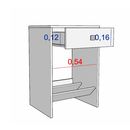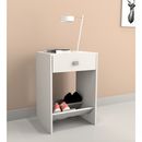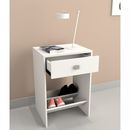 Mesa de luz de melamina. Un cajón con el interior totalmente revestido con la misma melanina, con correderas metálicas. Dos estantes inferiores botineros. Sistema Minifix. Tirador de plástico. Color Blanco. Medidas: Ancho: 0.45 mts. Alto: 0.70 mts. Profundidad: 0.36 mts.