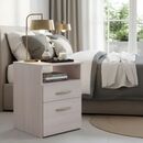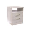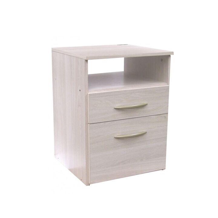 Mesa de Luz de melamina. Una puerta con un estante interno. Un cajón con correderas metálicas. Interiores revestidos. Color Gris Andino. Medidas: Ancho: 0.45 mts. Alto: 0.65 mts. Profundidad: 0.45 mts.
