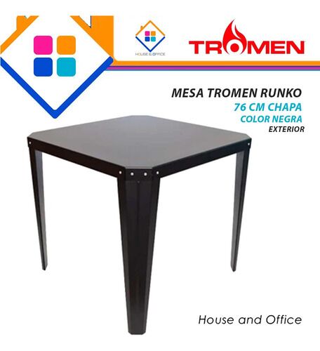 MESA TROMEN RUNKO 76 CM CHAPA NEGRA EXTERIOR Marca:Tromen Código: 06-000-008T LÍNEA RUNKO ESTILO + FUNCIÓN + COMODIDAD Disfrutalas en galerias, quinchos y espacio semicubiertos como patios, terrazas, balcones y jardines ROBUSTAS Y SOLIDAS Ideal para locales gastronómicos y comerciales Dimensiones AN...