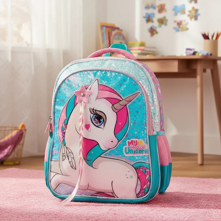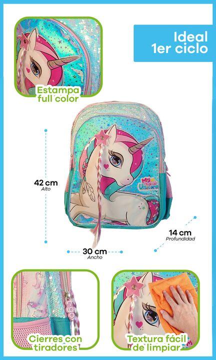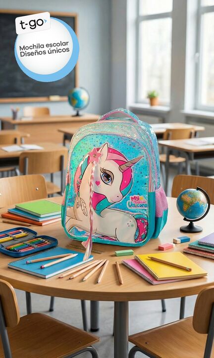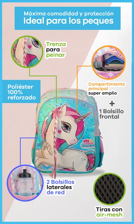 Mochila Escolar Espalda T-go para primaria Nena Unicornio Trenza 3D Lentejuelas Este modelo es único: tiene un unicornio con trenza de pelo real para peinar y lentejuelas que a tu hija le van a fascinar. Para vos, la tranquilidad de T-Go: una mochila reforzada, espaciosa y fácil de limpiar, pensada ...