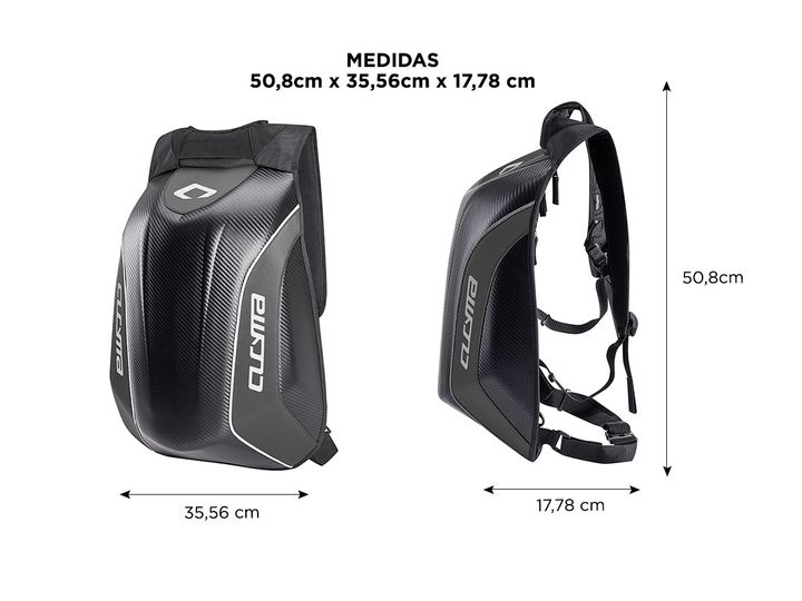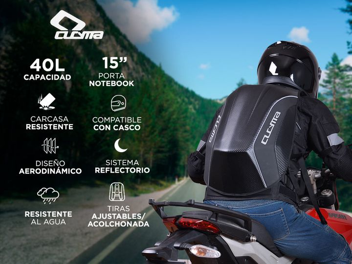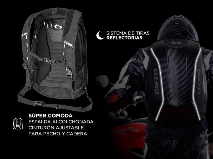 La Mochila Cucyma conocida mundialmente como de alta resistencia es para el motoquero de todos los días. Contiene una carcaza de fibra de carbono la cual le dará protección y durabilidad a lo largo del tiempo pero también confortabilidad y utilidad. Además de colocar casco, podrás llevar hasta Noteb...