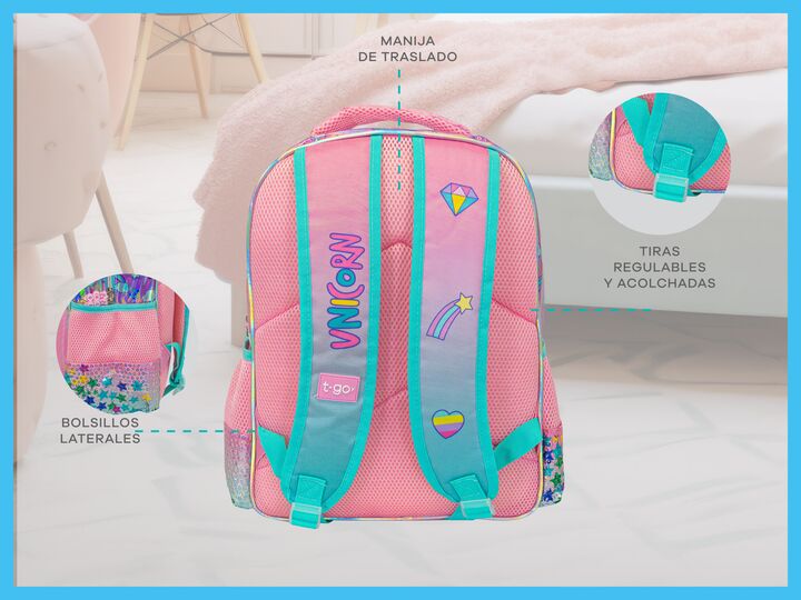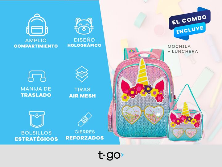 Excelente kit de mochila y lonchera escolar. Cuenta con un diseño precioso, materiales de calidad para una larga duración y espacio para todos los útiles y la vianda. CARACTERÍSTICAS PRINCIPALES MOCHILA -Compartimiento principal superamplio. -Bolsillo frontal con cierre de gran tamaño -2 bolsillos l...
