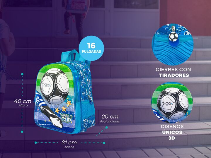 MOCHILA ESCOLAR PARA PRIMARIA 16 PULGADAS REFORZADA -Amplio compartimiento principal para que lleve sus libros, cuadernos y todo lo que necesite para el cole. -3 bolsillos adicionales para tener todo organizado: 2 laterales porta botellas u otros accesorios + 1 frontal con mucho espacio. -Fabricada ...