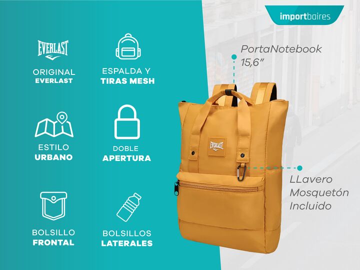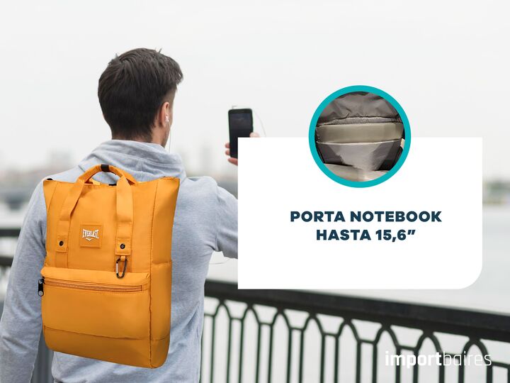 MOCHILA EVERLAST PORTA NOTEBOOK 15.6 PULGADAS • Espacio separador especial para notebook hasta 15.6 • Apertura de mochila doble ( al frente y en la espalda ) • Tamaño de capacidad ideal para uso urbano, viajes y paseos • Ajuste pectoral frontal con hebilla • Bolsillo Frontal intermedio • Doble organ...