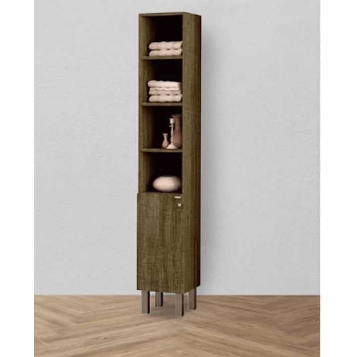 Módulo alto con una puerta. Melamina texturada de 18 mm de espesor. Tiradores metálicos. 5 estantes. Patas regulables en altura. Alto: 1.81 mts. Ancho: 0.30 mts. Profundidad: 0.30 mts.