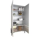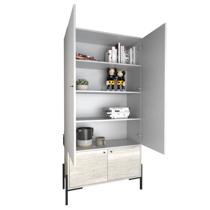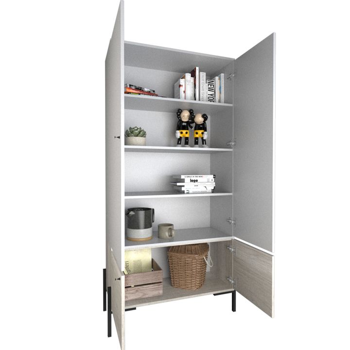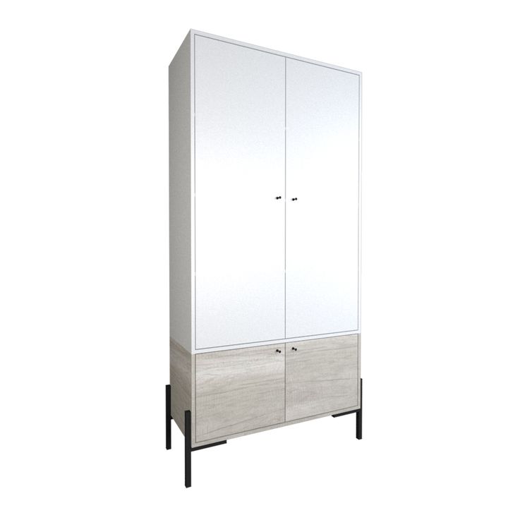 Módulo o columna alta Línea MetalWood. Melamina de alta resistencia. Patas metálicas tipo industrial. Regatones de goma. Cuatro puertas, dos altas y dos bajas. Bisagras metálicas. Tiradores metálicos. Color Everest y Nevado. Medidas: Ancho: 0.90 mts. Alto: 1.83 mts. Profundidad: 0.36 mts. P...