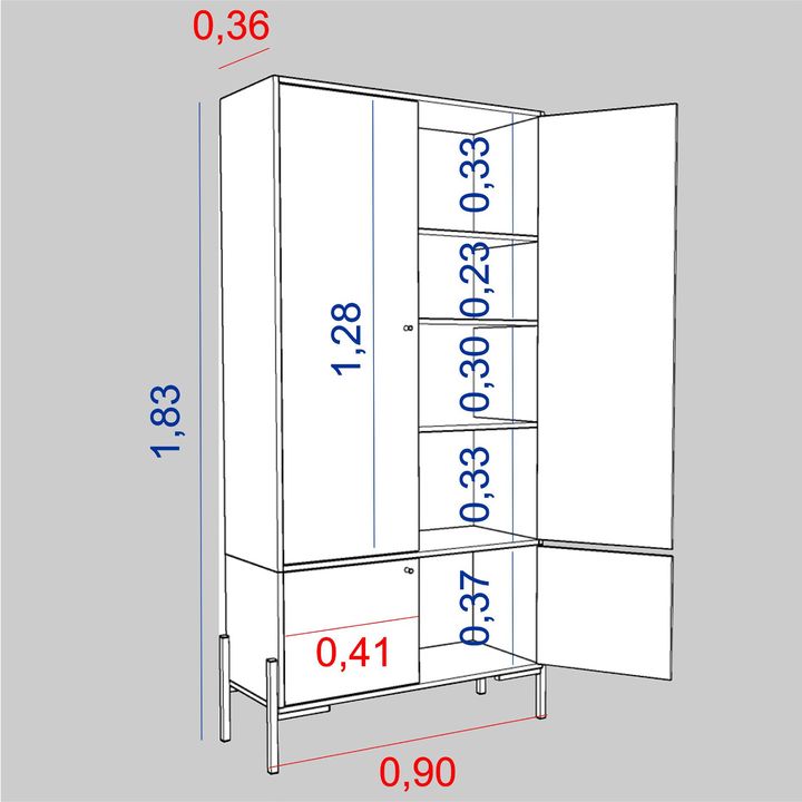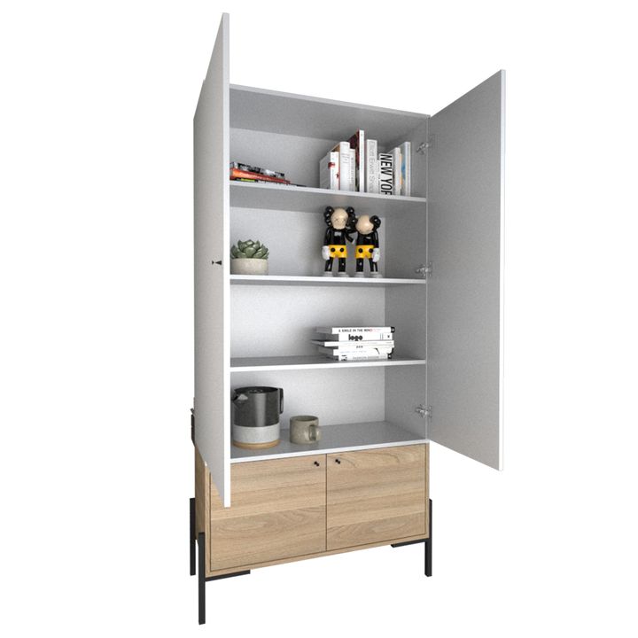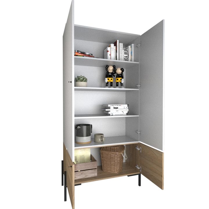 Módulo o columna alta Línea MetalWood. Melamina de alta resistencia. Patas metálicas tipo industrial. Regatones de goma. Cuatro puertas, dos altas y dos bajas. Bisagras metálicas. Tiradores metálicos. Color Everest y Olmo Finlandés. Medidas: Ancho: 0.90 mts. Alto: 1.83 mts. Profundidad: 0.3...