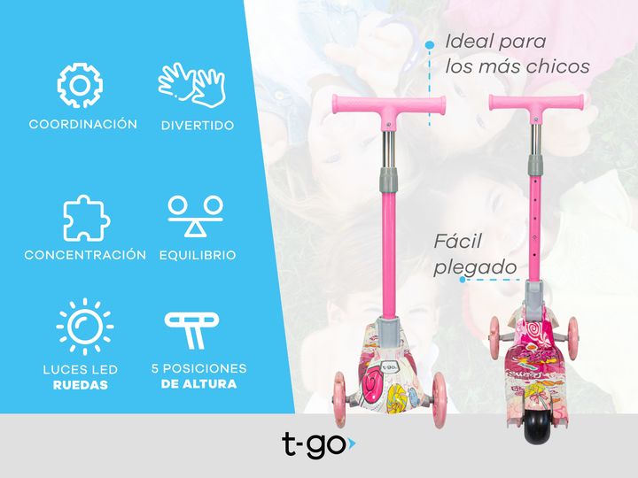 Monopatín infantil para niños plegable con luces led y altura regulable - Edad recomendada: Hasta 3 años - Novedoso modelo plegable - Marca : T-go - Peso soportado: Hasta 30 kg - Luces led en las ruedas que se activan por aceleración - 5 alturas regulables (60 cm, 65 cm, 70 cm, 75 cm y 80 cm) - Mate...
