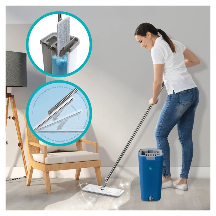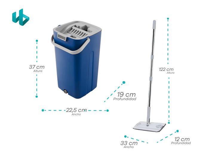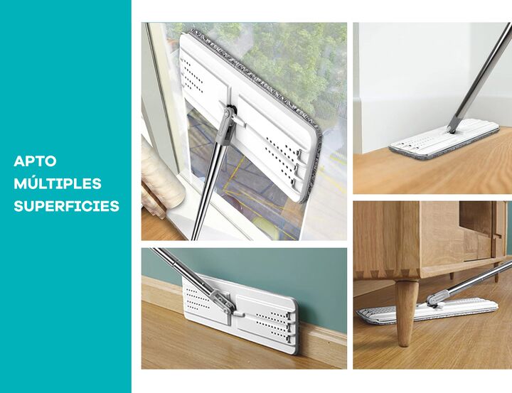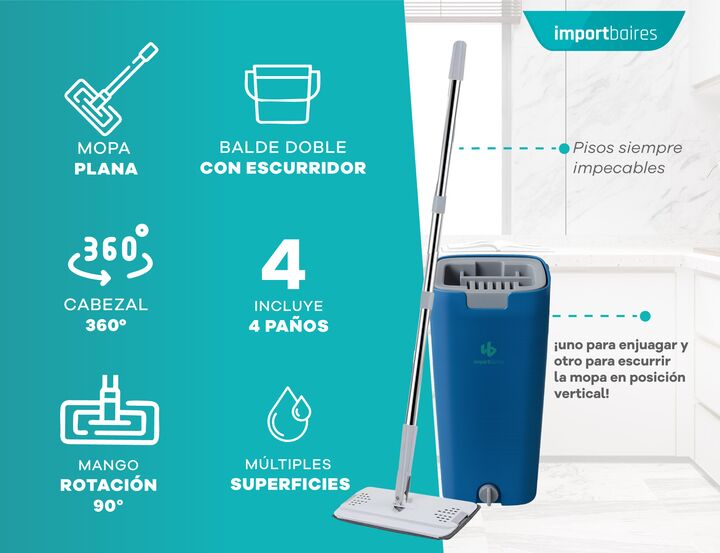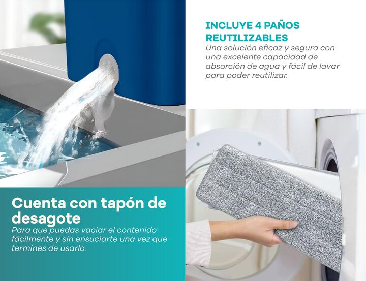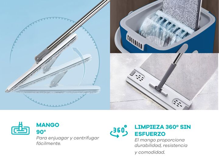 Mopa Plana con Balde Doble Compartimiento y 4 Paños de Microfibra Incluye 4 paños reutilizables: de microfibra suave, súper absorbente y fáciles de colocar y lavar. Especificaciones técnicas: Material del bastón: acero inoxidable + polipropileno Material del balde: polipropileno resistente Sistema d...