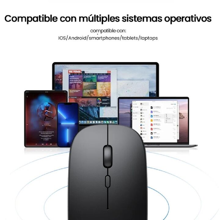 Descripción : El mouse inalámbrico recargable Bluetooth Dualmode es una opción práctica y versátil para quienes buscan comodidad y portabilidad en el uso diario. Su sistema de conexión dual permite utilizarlo tanto mediante receptor USB inalámbrico como por Bluetooth, adaptándose fácilmente a notebo...