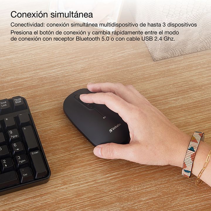 MOUSE VERBATIM WIRELESS RECARGABLE MULTIPLES DISPOSITIVOS 70750 ¡Conecta todos tus dispositivos favoritos simultáneamente con el Mouse óptico inalámbrico recargable para múltiples dispositivos! Presiona el botón de conexión y cambia rápidamente entre el modo de conexión con receptor Bluetooth 5.0 o ...