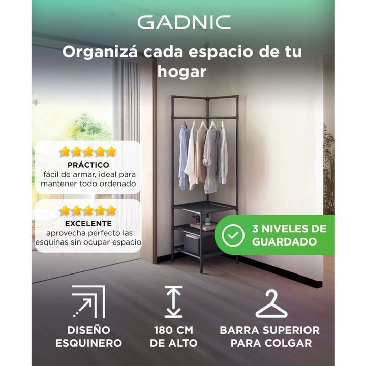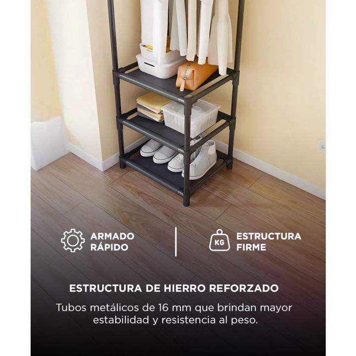 Diseño Esquinero Funcional: Aprovechá al máximo los rincones de tu hogar con este organizador compacto y moderno que optimiza cada centímetro de espacio. Estructura Metálica Reforzada: Tubos de hierro de 16 mm brindan firmeza y soporte para prendas, cajas y accesorios sin deformaciones. Triple Nivel...