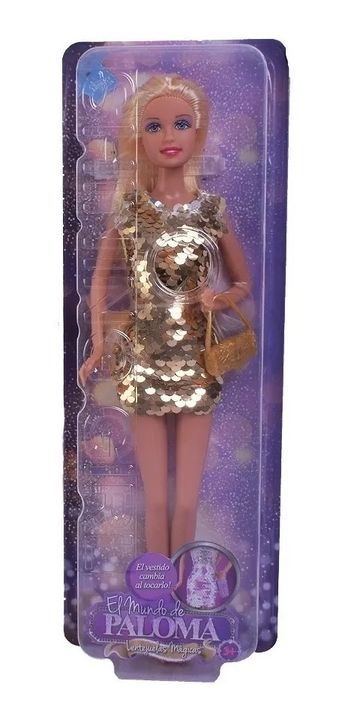 Muñeca Paloma Vestido Con LentejuelasEl Mundo De PalomaA Paloma le fascina lucir siempre a la moda. Entre sus prendas preferidas, están los vestidos con brillos y lentejuelas, los cuales cambian de color mágicamente. Para sus salidas combina estos mágicos vestidos con divinas carteras. Edad mínima r...