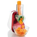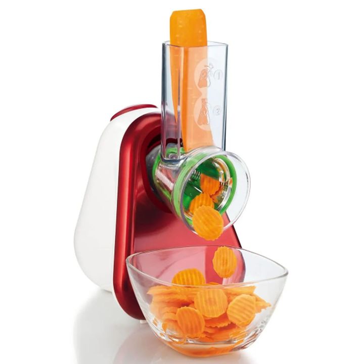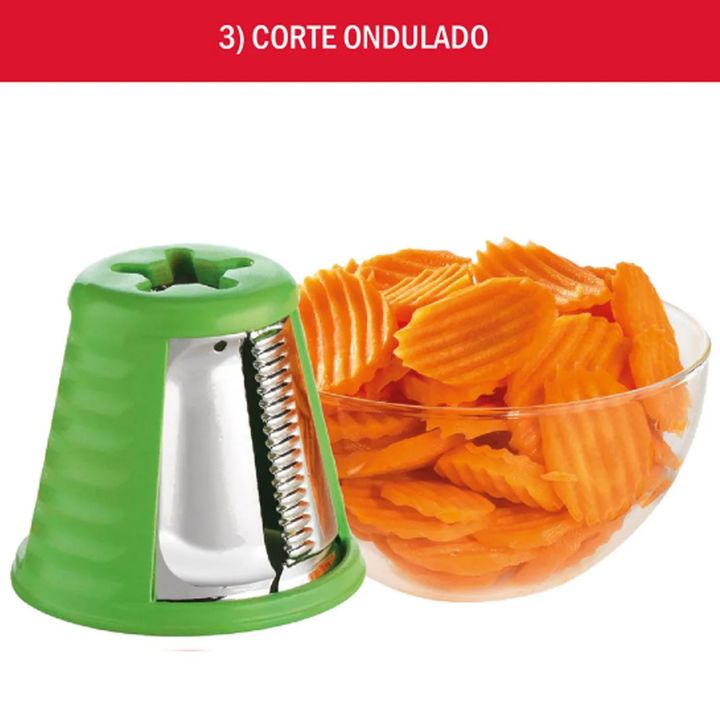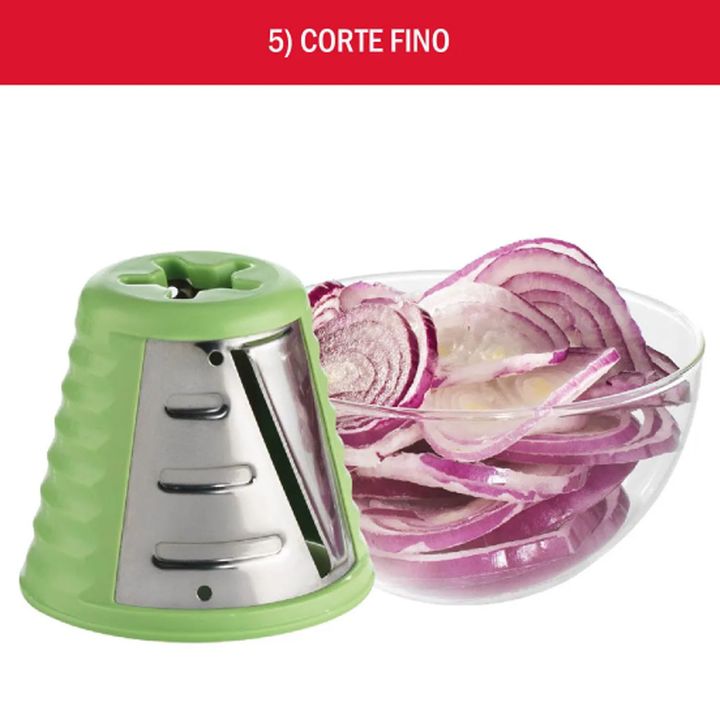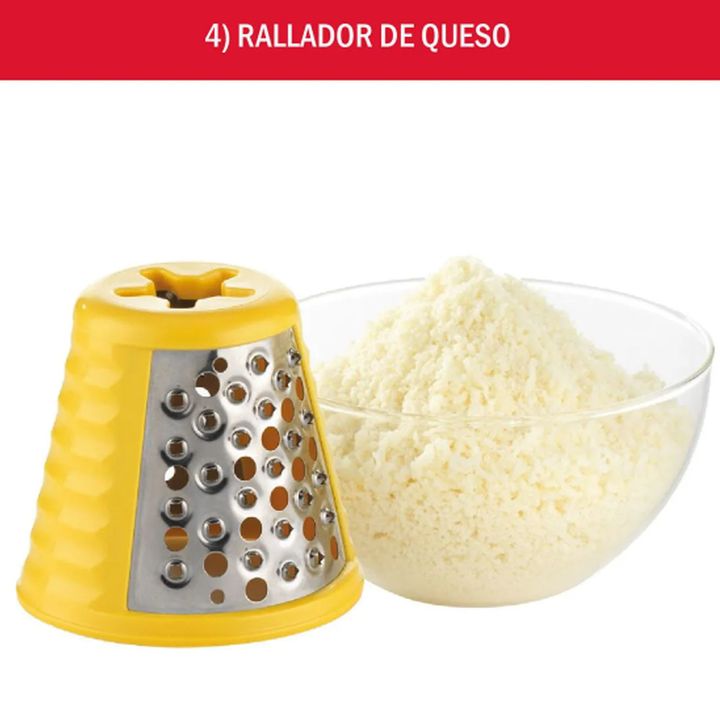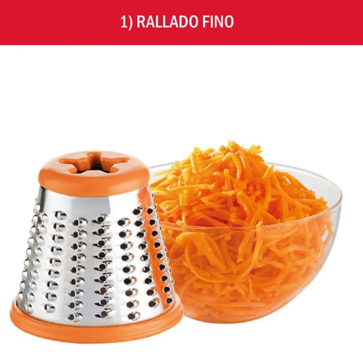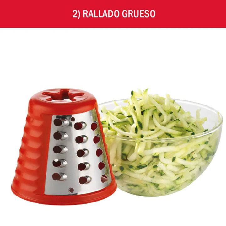 Rallador para múltiples usos. Tubo con sencillo sistema de alimentación. Incluye 5 accesorios de corte de acero inoxidable. Accesorios apilables que se guardan en el propio aparato. 5 funciones: rallar fino y grueso, cortar fino y grueso y rallar queso.