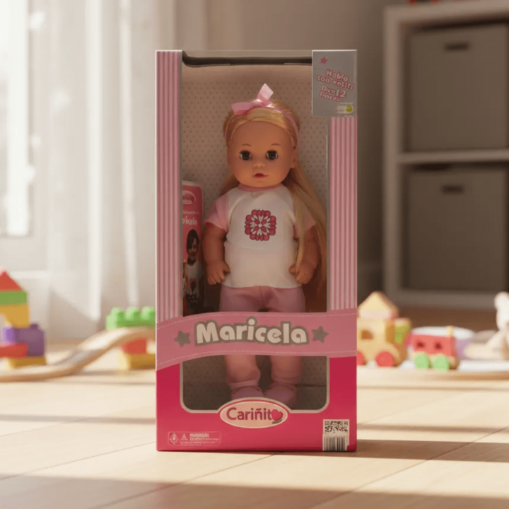Muñeca Cariñito Maricela 40cm 12 frases varios vestuarios Articulada en brazos y piernas. Habla con tu muñeca! Contiene 12 tipos de frases diferentes Convertí a Marícela en tu mejor amiga! Cada presentación tiene un vestuario único e inigualable. Las prendas son surtidas/aleatorias.