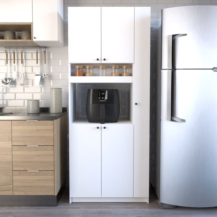 Organizador multifunción en melamina. Interiores revestidos. Cinco puertas con bisagras metálicas, una de ellas vertical para guardado de escobas. Espacio medio para microondas (0.50 mts de ancho). Estante especiero. Manijas metálicas. Sistema Minifix. Medidas: Ancho: 0.71 mts. Alto: 1.79 mts. Profu...