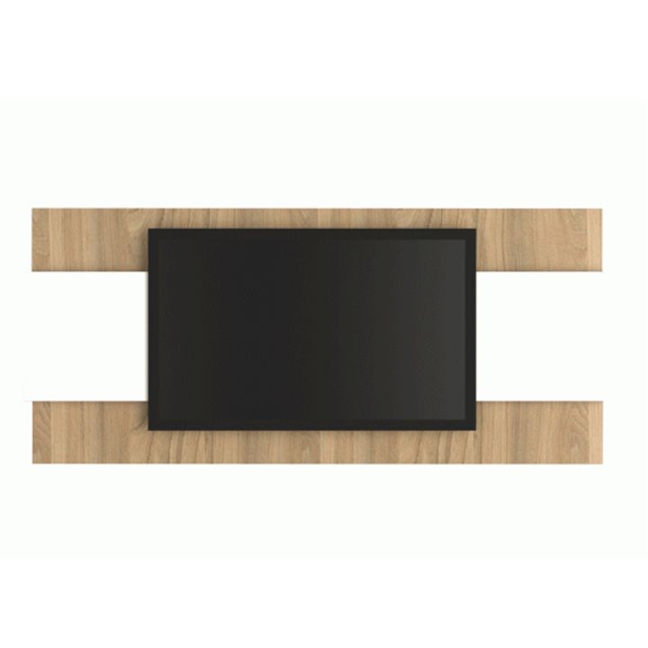 Panel para Tv de 65, de melamina bicolor. Incluye Kit de soporte y tornillos para amurar a la pared. Orificios pasacables. Color Olmo Finlandés y Everest Medidas: Ancho: 1.80 mts. Alto: 1.02 mts. Profundidad: 0.05 mts.