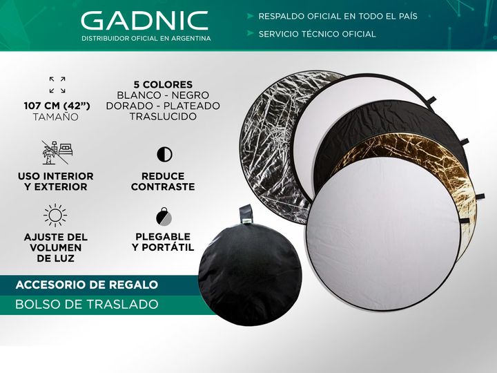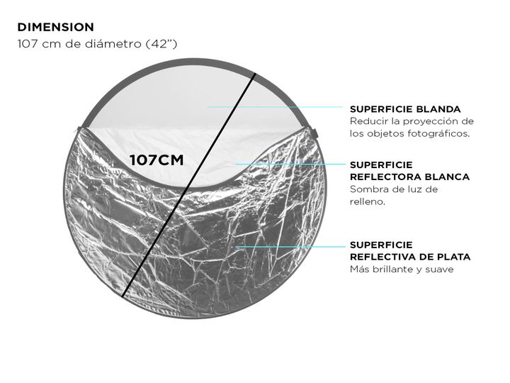 El reflector 5 en 1 de 107 cm es la herramienta ideal para lograr fotografías profesionales gracias a su versatilidad en el manejo de la luz y sombras. Con sus cinco superficies —Oro, Plata, Blanco, Negro y Translúcido—, te ofrece una variedad de efectos para difuminar, absorber, reflejar o suavizar...