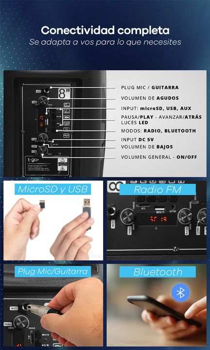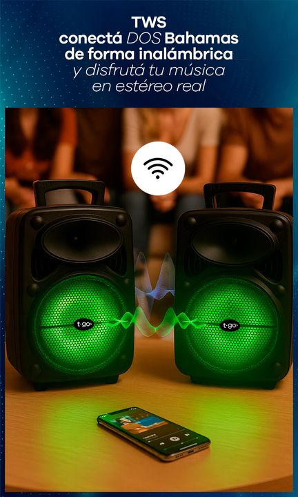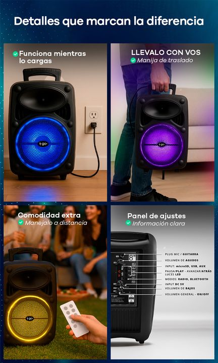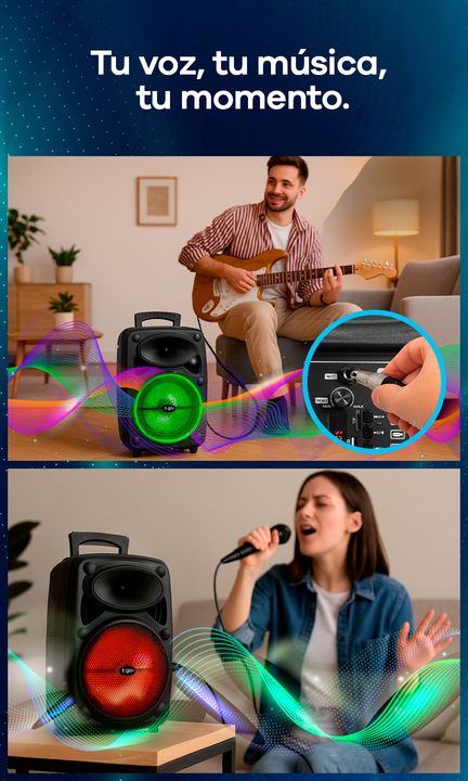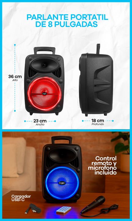 PARLANTE PORTÁTIL 8 PULGADAS BLUETOOTH CON LUCES Y USB -Potencia: 3000 P.M.P.O -Parlante de 8 pulgadas -Batería interna recargable -Juego de Luces Led de colores con modos rítmicos -Conexión TWS que te permite emparejar y conectar dos parlantes iguales. -Conexión Bluetooth -Entradas: USB, microSD, A...