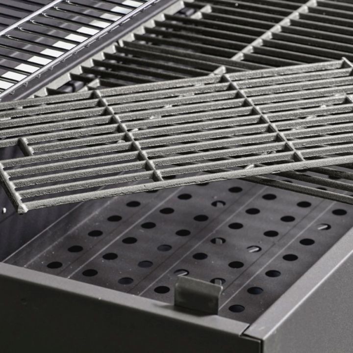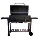Parrilla portatil tradicional a carbon - Doble mesada lateral y estante para carbon - Manija para regular altura del fuego - Ganchera para colgar accesorios - Destapa botellas - Tapa con pirometro - Grill en acero de fundicion en tres tramos - Ruedas para facilitar traslado - Pintura en polvo de alt...