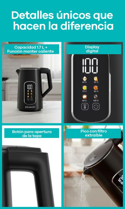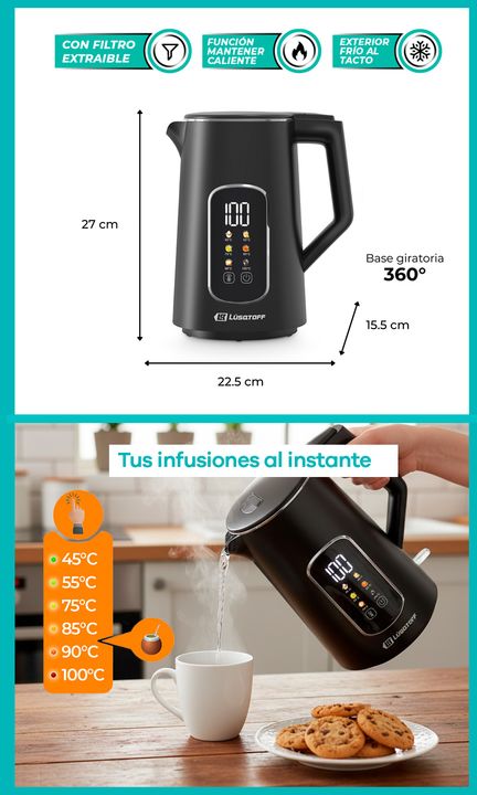 Pava Eléctrica Lusqtoff LQ-PV806 1,7L 2200W con Display Digital -Capacidad de 1,7 litros. -Potencia 1850 a 2200W. -Control digital con 6 temperaturas preestablecidas (de 45, 55, 75, 85, 90 y 100°C). -Función mantener caliente. -Base giratoria 360° con conexión central. -Exterior frío al tacto gracia...