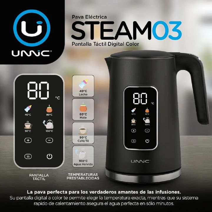 Descripción : La pava eléctrica Unnic Kettle03 combina diseño moderno, precisión y seguridad para que disfrutes tus infusiones con la temperatura ideal. Su pantalla LED táctil permite seleccionar fácilmente entre cuatro opciones preconfiguradas : 40 °C para leche de fórmula, 80 °C para mate, 90 °C p...