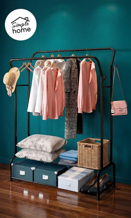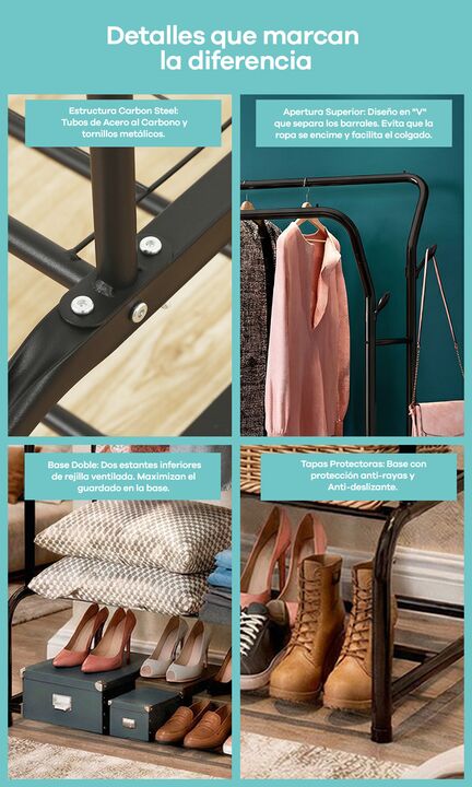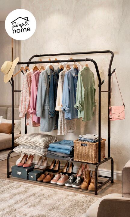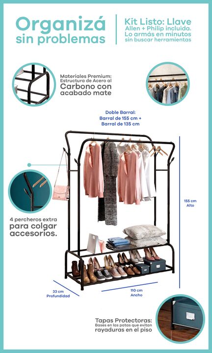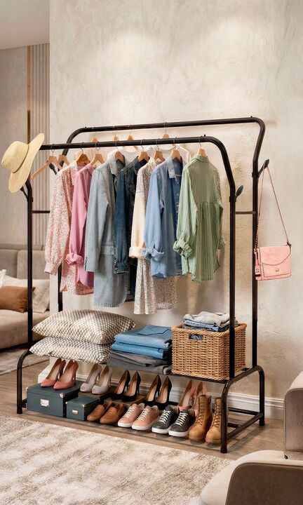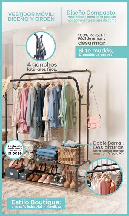 Perchero Vestidor de pie Doble Barral de Acero con Estantes y percheros extra Nuestro Perchero Vestidor Móvil combina diseño y funcionalidad en una solución de orden completa. Con su estética industrial estilo boutique y su gran capacidad de doble barral, te permite organizar toda tu ropa, calzado y...